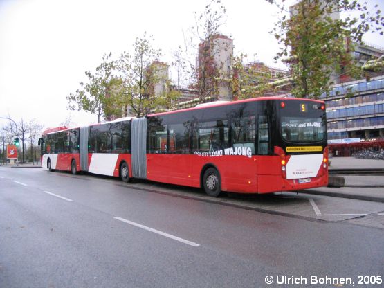 Hier sieht man die Bezeichnung der Doppelgelenkbusse, die im Rahmen eines Gewinnspiels gefunden wurde: "ÖCHER LONG WAJONG" - ins Hochdeutsche übersetzt "Aachener langer Wagen".