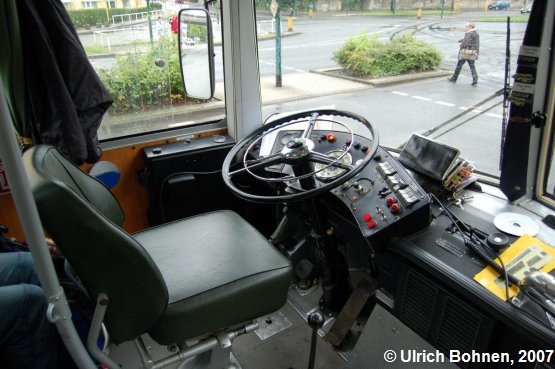 Hier ein Blick auf das klassische Cockpit. Der Bus verfügt über ein Schaltgetriebe, wie der lange Schalthebel im Bild unten verrät.