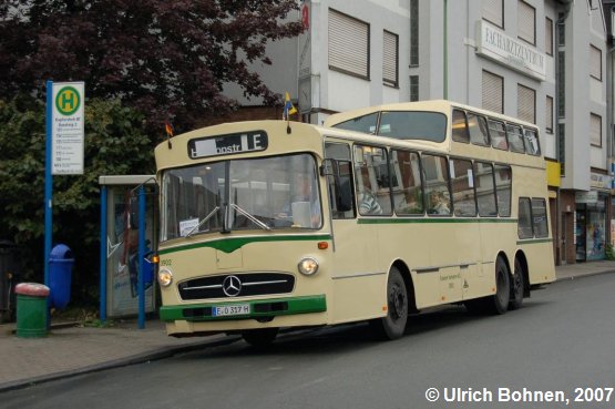Die Haltestellenanlage am S-Bahnhof in Kupferdreh wurde auch angesteuert. Anscheinend ließ sich der vordere Zielfilm nicht mehr verstellen, so dass die Anzeige mit einem weißen Blatt Papier sozusagen auf neutral gestellt wurde.