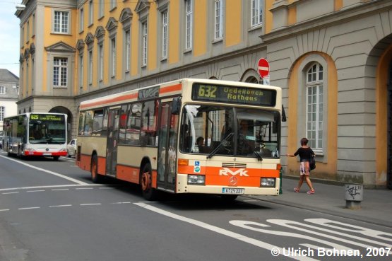 In der Nähe des Bonner Marktes konnte mit dem RVK-Wagen 227 ein EvoBus-Mercedes O 405 N² in der klassischen und mittlerweile nicht mehr benutzten RVK-Lackierung fotografiert werden.