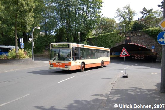 Der RVK-Wagen 954 hat gerade die Bahngleise am Bad Godesberger Bahnhof unterquert.
