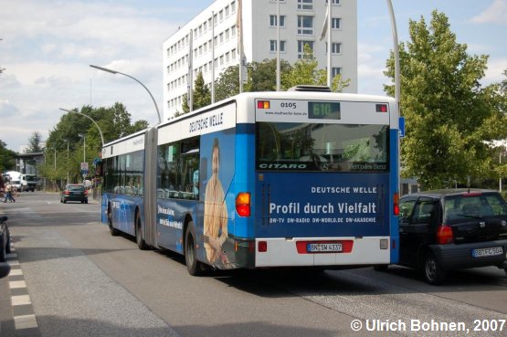 Er trägt eine Vollwerbung für die Deutsche Welle, an deren Zentrale er auch gerade vorbeifährt.