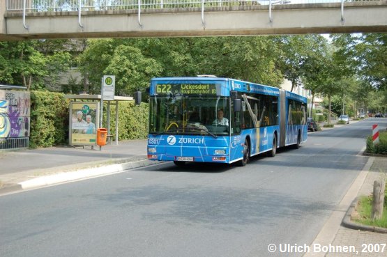 Wagen 0301 der SWB trägt eine Vollwerbung für eine Versicherung und passiert gerade die Haltestelle Kardinal-Frings-Gymnasium in Bonn-Beuel auf der rechten Rheinseite.