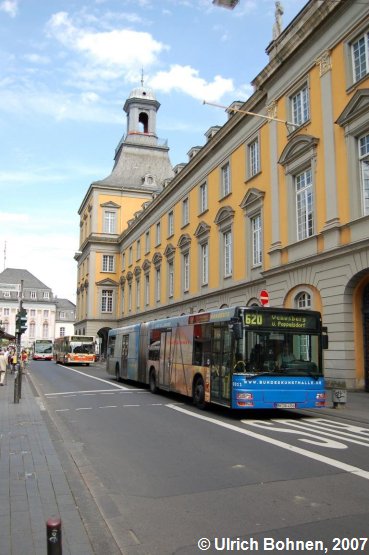 In der Nähe des Bonner Marktes konnte Wagen 0311 fotografiert werden, der mit einer Vollwerbung für die Bundeskunsthalle in Bonn ausgestattet ist. Ihm folgen je ein Bus der RVK und SWB.