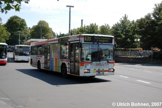 Neuer als der gerade gezeigte Citaro ist dieser EvoBus-Mercedes O 405 N², der ja bekanntlich die Vorgänger-Baureihe des Citaro ist. Wagen 9803, der 1998 gebaut wurde, verlässt gerade den Bonner Hbf.
