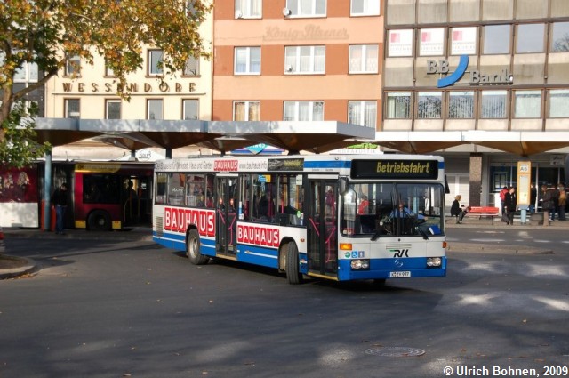 Die Lackierung der Rhein-Erft-Verkehrsgesellschaft trägt der RVK-Wagen 997, der am Bonner Hauptbahnhof im Sonnenschein angetroffen werden konnte.