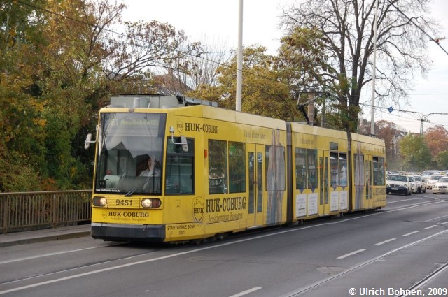 Offensichtlich 1994 gebaut wurde diese Straßenbahn, die noch die Firma Duewag konstruiert hat. Die Aufnahme entstand zwischen den Haltestellen Thomas-Mann-Straße und Bonn Hbf.
