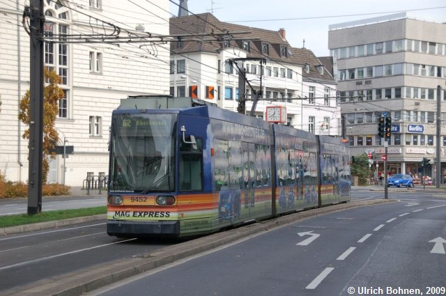 Zahlreiche Bonner Straßenbahnen sind mit Ganzreklamen versehen, so auch der Wagen 9452.