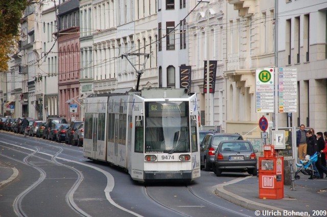 Gerade die Haltestelle Thomas-Mann-Straße verlassen hat der Wagen 9474, der nun auf geschwungenem Wege weiter Richtung Oberkassel fährt.