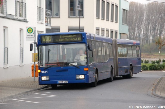Wenig später zog der Bus zur Abfahrtshaltestelle Kranenweg vor. Im Hintergrund fließt der Rhein.