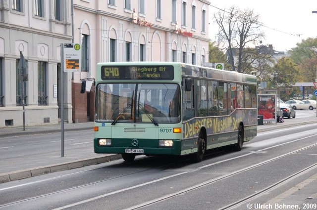 Wagen 9707 wirbt für das Deutsche Museum in Bonn und hat gerade den Fahrgastwechsel an der Haltestelle Thomas-Mann-Straße vollzogen.