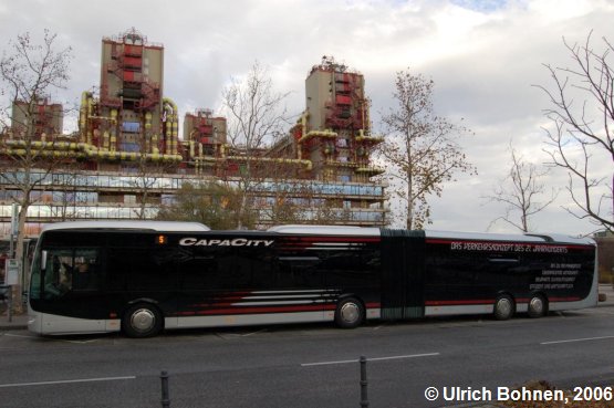 Nun eine seitliche Aufnahme mit Teilen der markanten Uniklinik im Hintergrund. Es ist kaum zu glauben, dass der Wendekreis des CapaCity nicht größer als der eines normallangen Gelenkbusses ist.