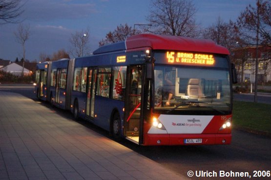 ... und zwar mit einem der beiden Doppelgelenkbusse von Van Hool, der ebenfalls auf den Linien 5 und 45 unterwegs war. Der Van Hool AGG 300 steht hier am späten Nachmittag am Brander Schulzentrum.