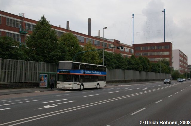 Vor der Kulisse des bei Dunkelheit beleuchteten Bayer-Kreuzes zeigt sich der Sonderfahrt-Bus in Leverkusen.
