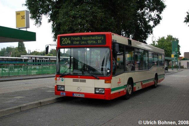 Zu den ältesten Bussen der Wupsi gehört dieser Mercedes-Benz O 405 N², der 1994 in Dienst gestellt wurde. Auf diesem Bild steht er am richtigen Abfahrtbussteig in Leverkusen-Mitte.