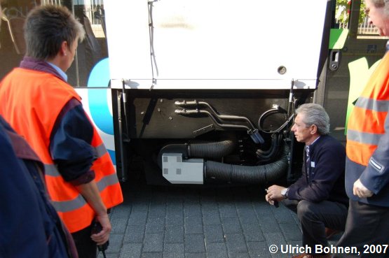 Auch für die Rheinbahn-Mitarbeiter interessant: Ein Blick auf die Technik des Hybrid-Doppelgelenkbusses.