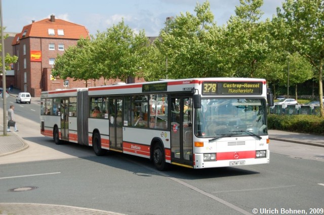 Zu den älteren Bogestra-Fahrzeugen gehört mit Baujahr 1997 dieser EvoBus-Mercedes O 405 GN2, der gerade die Haltestelle Lütgendortmund S verlässt.