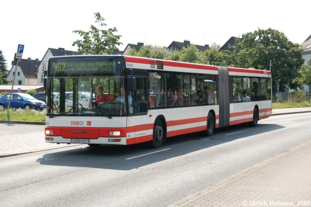 1999 wurde dieser MAN NG 263 beschafft, der bei Gegenlicht die Haltestelle Lütgendortmund in wenigen Augenblicken erreichen wird.