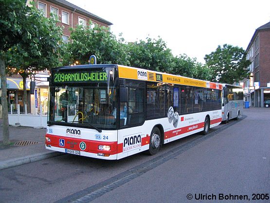 Am Abend des 20.07.2005 präsentiert sich der Wagen 24, ein MAN NL 263, am Dürener Kaiserplatz der Digitalkamera. Direkt dahinter befindet sich ein weiterer Bus, der an anderer Stelle in dieser Fotoserie gezeigt wird.