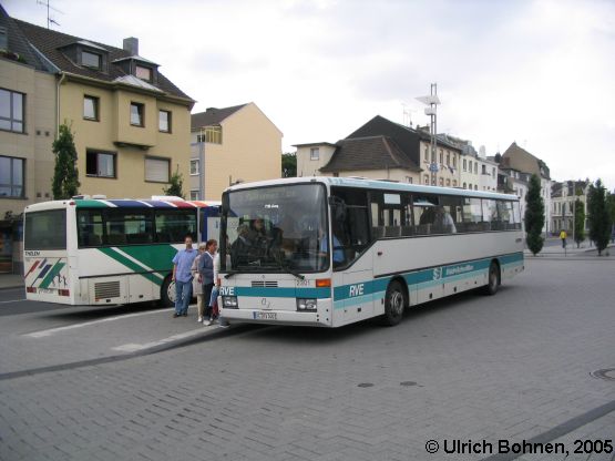 Zwei Mercedes-Benz O 408 befanden sich zum Aufnahmezeitpunkt gleichzeitig am Euskirchener Bahnhof: Zum einen der O 408 von Thelen aus Zülpich, zum anderen der O 408 (Wagen 5001) der RVE.