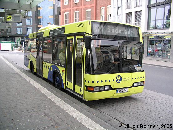 Deutlich zu sehen ist, dass die Neoplan N 4011 (hier ein Exemplar der Euskirchener Firma Laschke) hinten mit Schwenkschiebetüren ausgestattet sind. Gleich wird dieser Bus vom Bahnhof aus in die Euskirchener Südstadt aufbrechen.