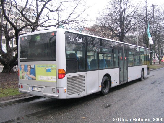Am Heck trägt das stattliche Fahrzeug eine Werbung für das VRR-Tagesticket.