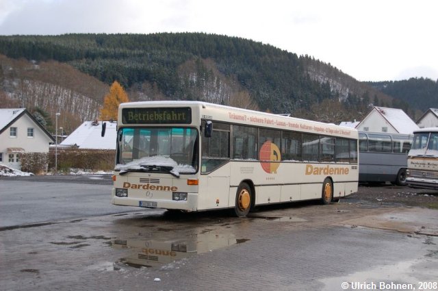 1992 wurde dieser Mercedes-Benz O 405 N im ostdeutschen Chemnitz in Dienst gestellt, ehe er zur Firma Univers nach Bonn gelangte. Seit 2001 wird dieser Bus von Dardenne eingesetzt. Im Hintergrund erheben sich die Hügel der Eifel.