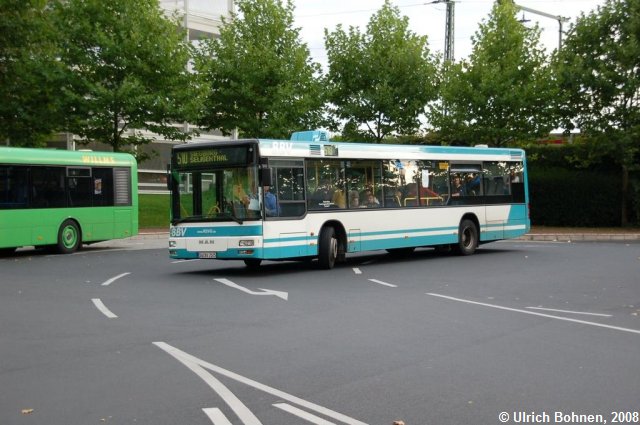 Der Bus mit seiner nachträglich angebrachten Klimaanlage verlässt gerade die Haltestellenanlage am Siegburger Bahnhof.