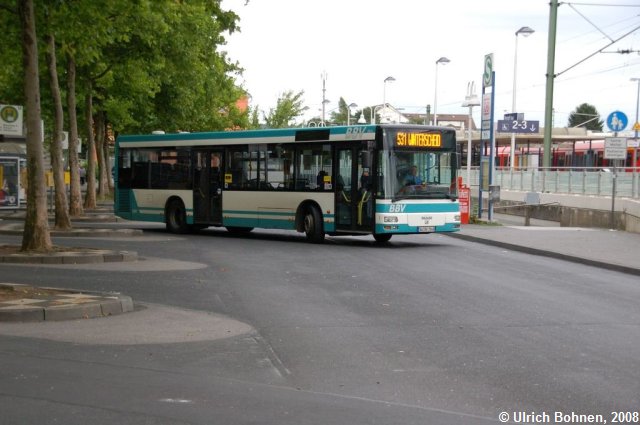 Der RSVG-Wagen 2548 verlässt gerade seine Haltestellenposition am Hennefer Bahnhof. Rechts befinden sich direkt die Bahnsteige.
