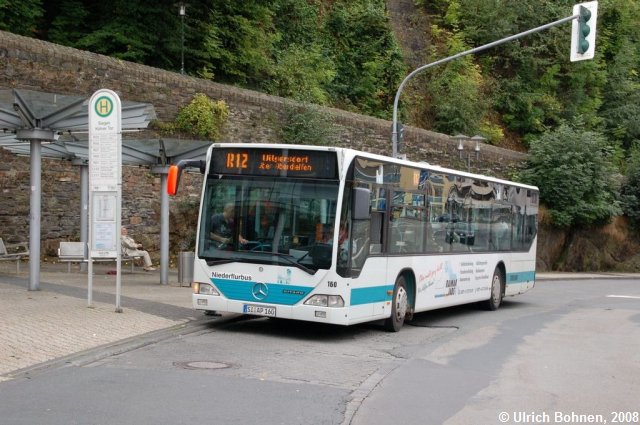 Am Kölner Tor in Siegen hält gerade der VWS-Wagen 160, der einen auffällig lackierten rechten Außenspiegel trägt. Dieser soll verhindern, dass an der Haltestelle wartende Fahrgäste zu nahe am Bordstein stehen und vom Spiegel "erschlagen" werden.