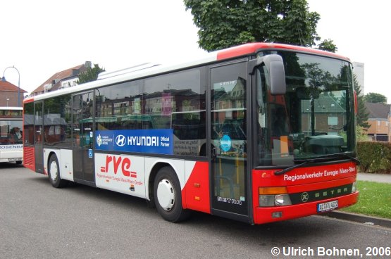 Von der RVE ist dieser EvoBus-Setra S 315 NF, der im Pausenbereich des Bushofs abgestellt war. Da er zeitweise im Fußball-WM-Shuttleverkehr in Köln eingesetzt wird, hat er entsprechende Sponsorenhinweise auf beiden Seiten und am Heck erhalten.
