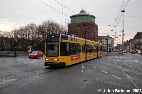 Wagen 1526 der EVAG fährt hier gerade am Wasserturm in Essen vorbei und wird in Kürze den Essener Hauptbahnhof erreichen.