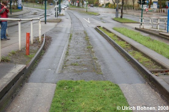 Auf der Wittenbergstraße ist hier gut der Übergang zwischen stillgelegten Tramgleisen und der Spurbusstrecke zu erkennen.