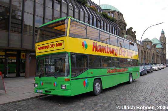 In Hamburg verkehren massig ehemalige Berliner Doppeldecker der Typen MAN SD 200 und SD 202, die als Stadtrundfahrt-Busse eingesetzt werden. Hier sehen wir einen MAN SD 202.