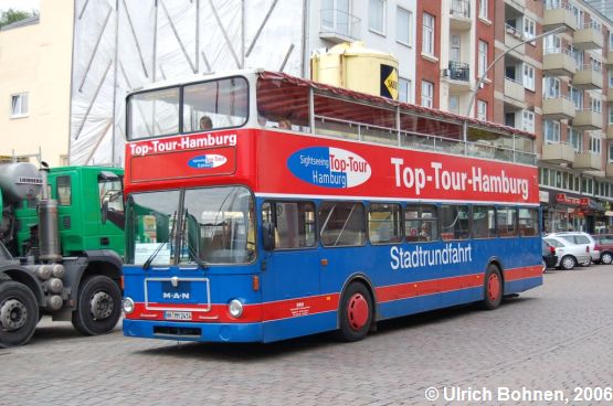 Charakteristisch bei den Stadtrundfahrt-Bussen sind die Planen im Oberdeck, die geöffnet werden können, so dass beinahe Cabrio-Feeling aufkommt. Dieses Exemplar wurde vor der Hamburger St.-Michaelis-Kirche (auch "Michel" genannt) aufgenommen.