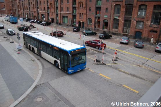 Die PVG (Pinneberger Verkehrs-Gesellschaft) schickte diesen O 530 L von Mercedes durch die Speicherstadt.