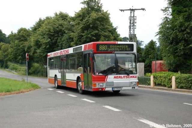 Die Lackierung seines Vorbesitzers Scalar aus Wittenberg trägt dieser 1994 gebaute MAN NL 202 von Herlitschka aus Kaarst. Der NE-TH 2014 wird nach Bedienung der Haltestelle Kloster Knechtsteden im Auftrag des BVR nach Dormagen weiterfahren.