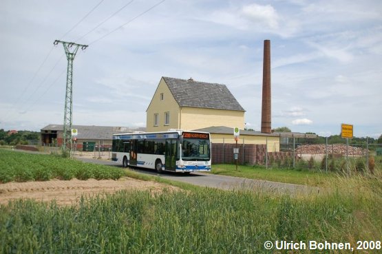 Die Haltestelle, die der Bus in Müddersheim gerade passiert, heißt Ziegelei. Im Hintergrund ist die entsprechende Ziegelei auch zu sehen.