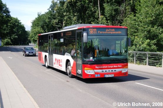 Auf einer Brücke am Jülicher Brückenkopfpark kam dieser EvoBus-Setra S 415 NF der RVE, Wagen 7001, vorbei.