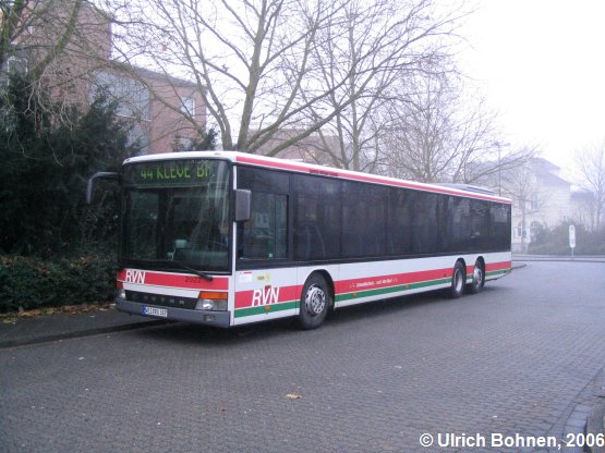 Auch die RVN (Regionalverkehr Niederrhein GmbH) aus Wesel kommt auf der Linie 44 nach Kleve. Wagen 387, ein 15 Meter langer EvoBus-Setra S 319 NF, verbringt hier gerade seine circa halbstündige Pause am Klever Bahnhof.