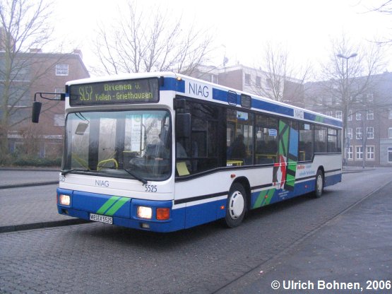 Wenig später kam der Wagen 5525 der Niederrheinischen Verkehrs-Aktiengesellschaft (NIAG), ein MAN NL 222 des Baujahres 1998, am Klever Bahnhof an. Das Fahrzeug wirbt für Stadtbus-Verkehre im Allgemeinen.