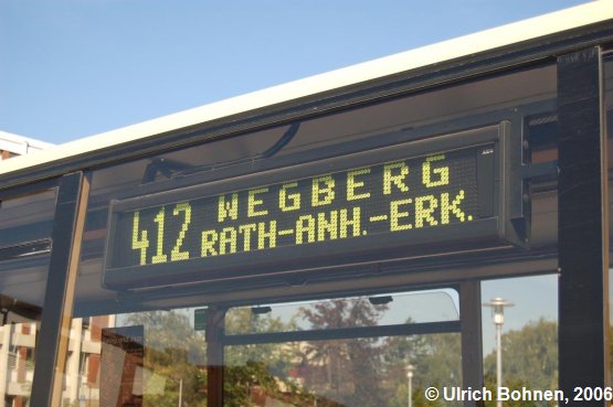Hier die seitliche Zielanzeige des Überlandbusses. Obwohl die zweite Zeile fast nur Abkürzungen enthält, kann man diese doch verstehen: Rath-Anhoven - Erkelenz
