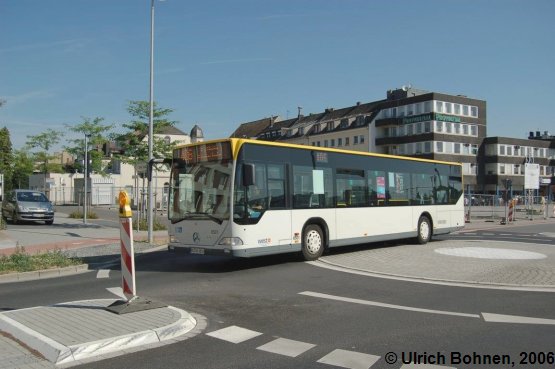Wagen 0501, ein 2005 beschaffter Mercedes Citaro, verlässt gerade das Gelände des Erkelenzer Bahnhofes.