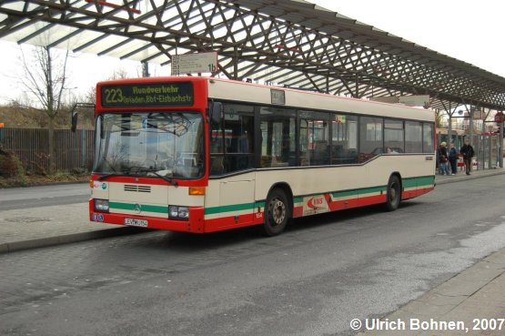 Die mittlerweile klassische Lackierung der KWS (Kraftverkehr Wupper-Sieg AG - "Wupsi") trägt dieser O 405 N², der die Wagen-Nr. 154 trägt. Entsprechend der Zielanzeige bedient er eine Ringbuslinie durch Leverkusen.