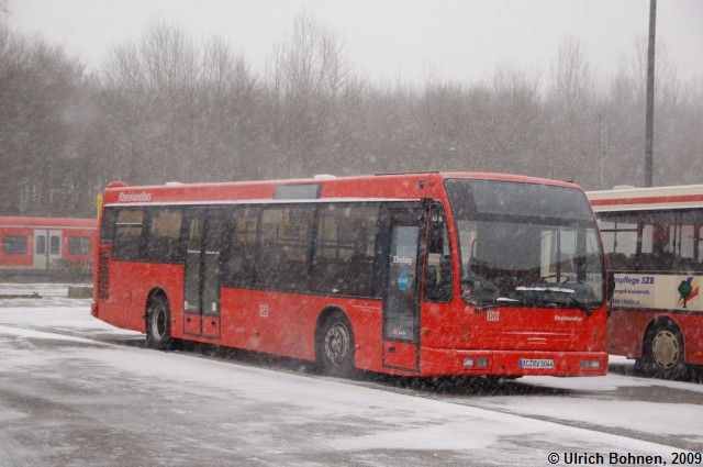 Die nördlichste RVE-Einsatzstelle befindet sich auf dem Betriebshof der west in Geilenkirchen. Während im Hintergrund ein Zug der RB 33 vorbeirollt, verbringt der RVE-Wagen 5044 im aktuellen Rheinlandbus-Design ebenfalls einen ruhigen Sonntag.