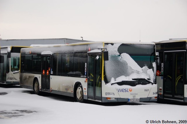 Im Jahre 2006 gelangten erstmals MAN Lion's City zur west. Wagen 0601 präsentiert sich hier halb zugeschneit auf dem Abstellplatz in Heinsberg.