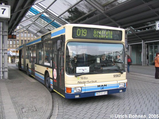 Wagen 9563, ein MAN A 11 (NG 312) gehört mit dem Baujahr 1995 zu den ältesten Niederflur-Gelenkbussen in Mönchengladbach. Auch er konnte am Mittag des 08.12.2005 am Mönchengladbacher Europaplatz angetroffen werden.