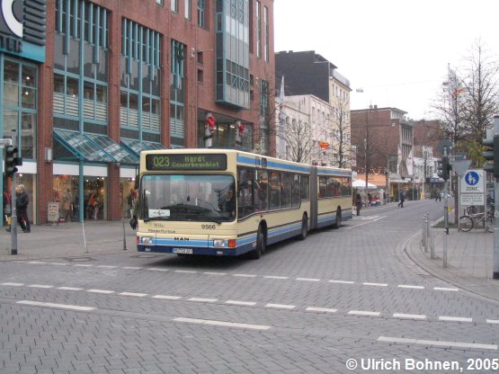Hier ist gerade einer seiner "Brüder", Wagen 9566, von der Hindenburgstraße kommend im Anflug auf den zentralen Busbahnhof in Mönchengladbach.