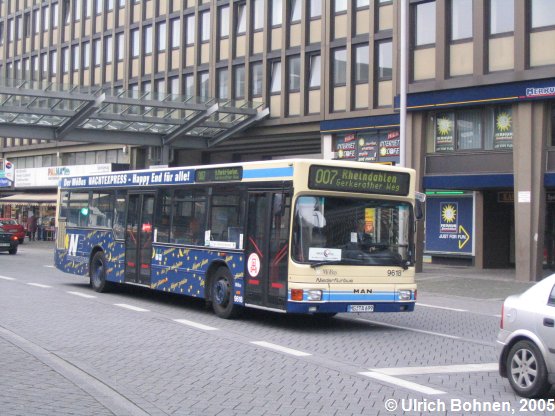 Für den NVV-Nachtexpress, der am Wochenende die kostengünstige Mobilität der "Nachteulen" sichert, wirbt Wagen 9618. Es handelt sich um einen MAN A 10 (NL 222), der im Jahre 1996 erstmals in Dienst gestellt wurde.