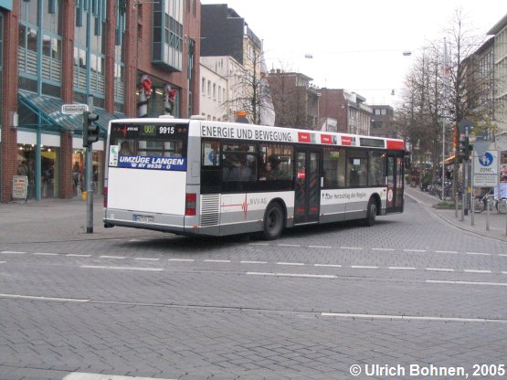 Hier biegt 9915 gerade auf die Hindenburgstraße ab, einer Fußgängerzone, in der Busse jedoch freie Fahrt haben.